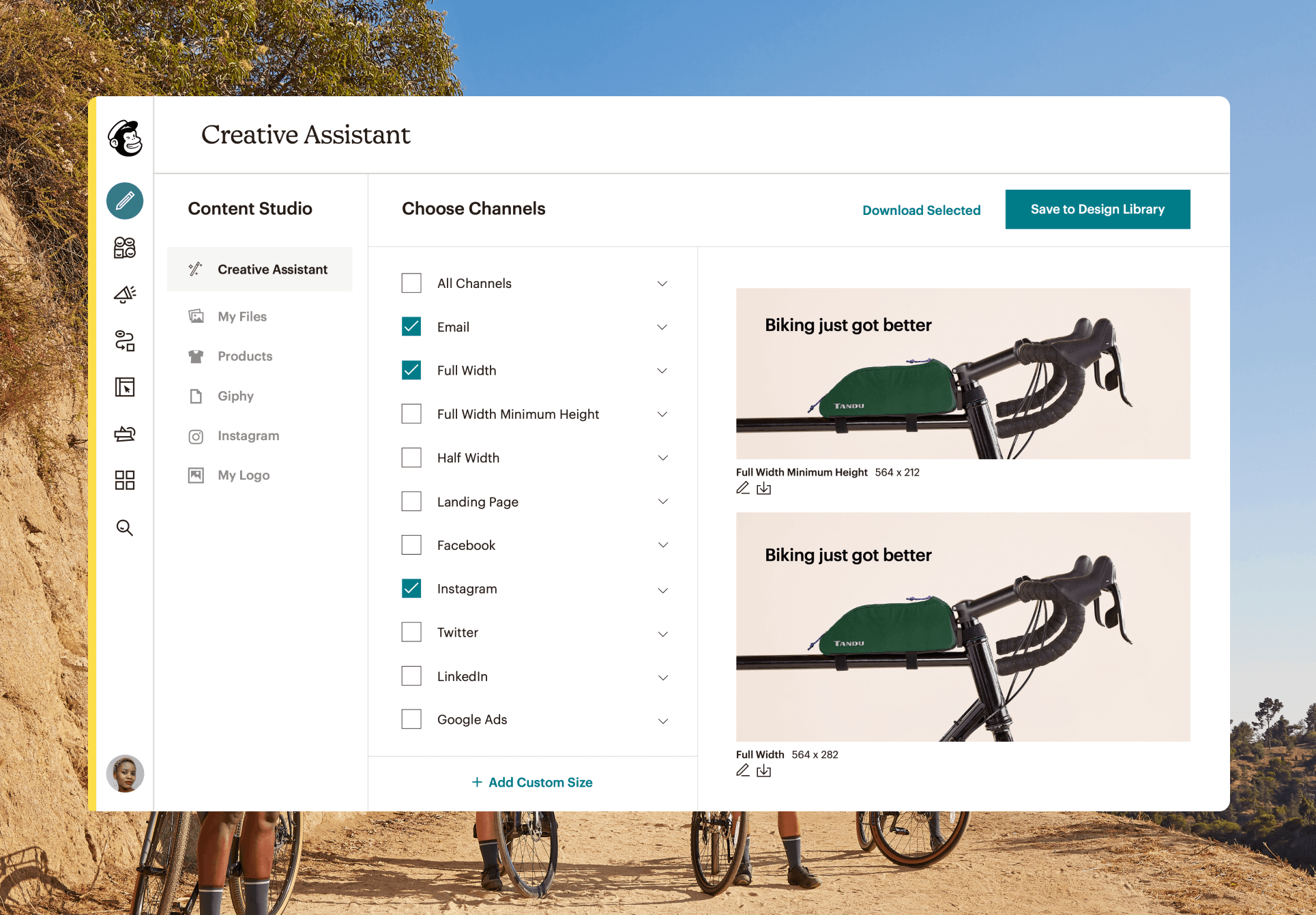 Cambiar el tamaño de las imágenes de los productos con el asistente creativo de Mailchimp para adaptarlo a canales de marketing específicos como el correo electrónico e Instagram.