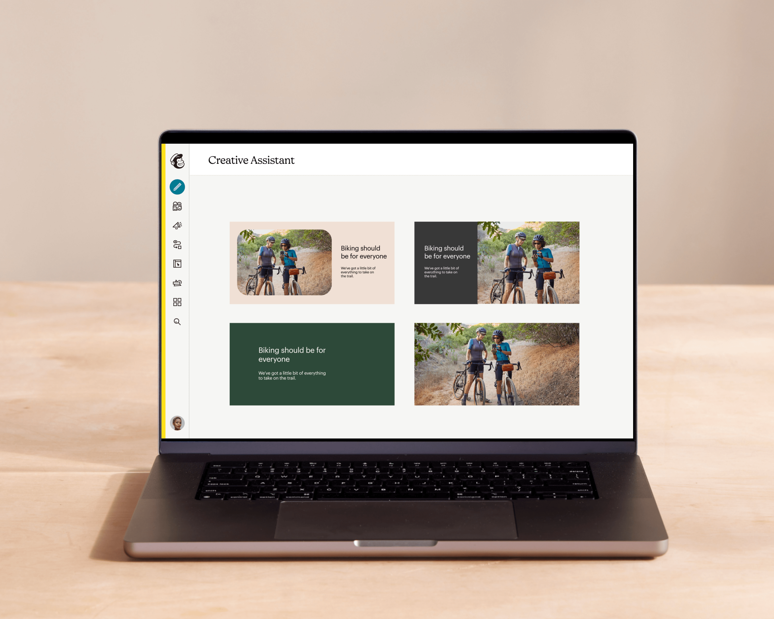 Pantalla de ordenador portátil abierta con el Asistente creativo de Mailchimp para generar bonitos diseños personalizados basados en tu marca.